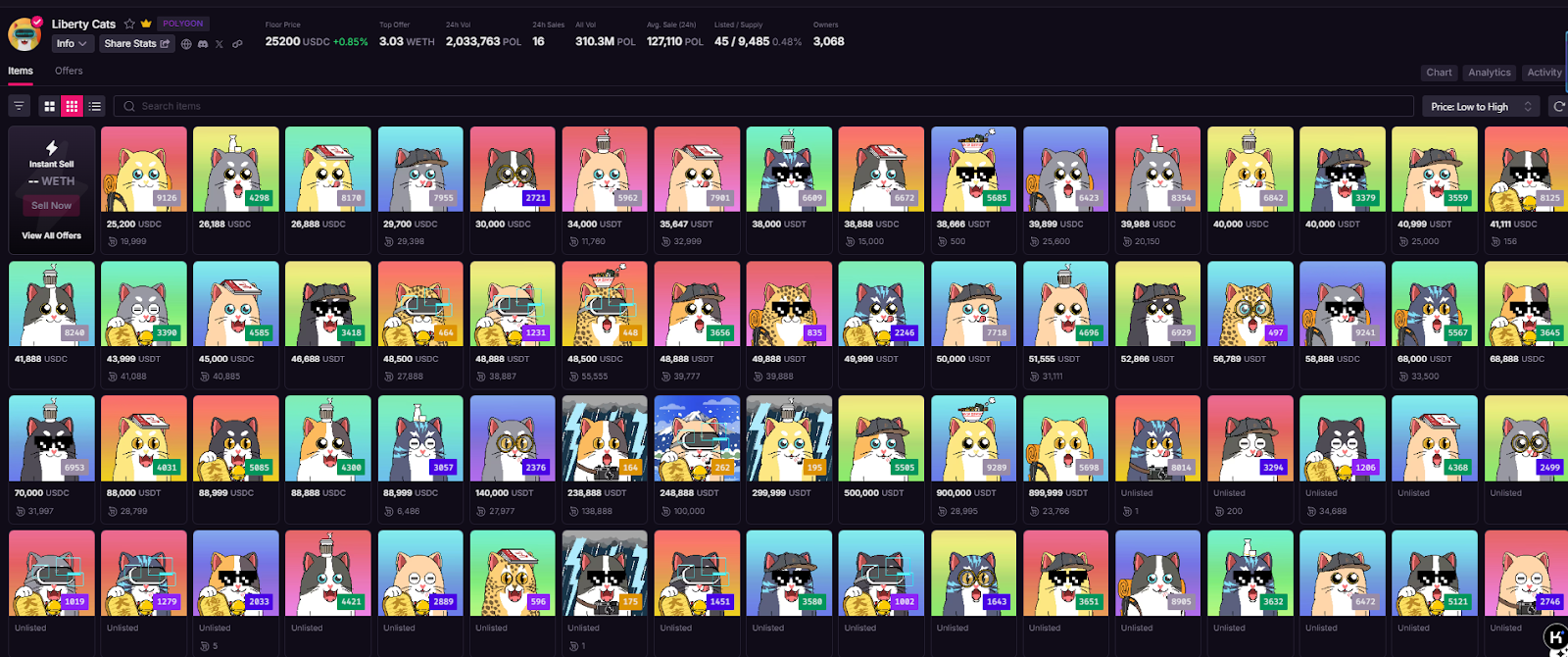 彼时,NFT市场正值熊市低谷,但Liberty Cats凭借强社区共识和渐进式运营策略,在5个月内完成价格从100 MATIC(约520元)到12000 MATIC(约6万元)的百倍跃升。这一阶段的成功可归结于: