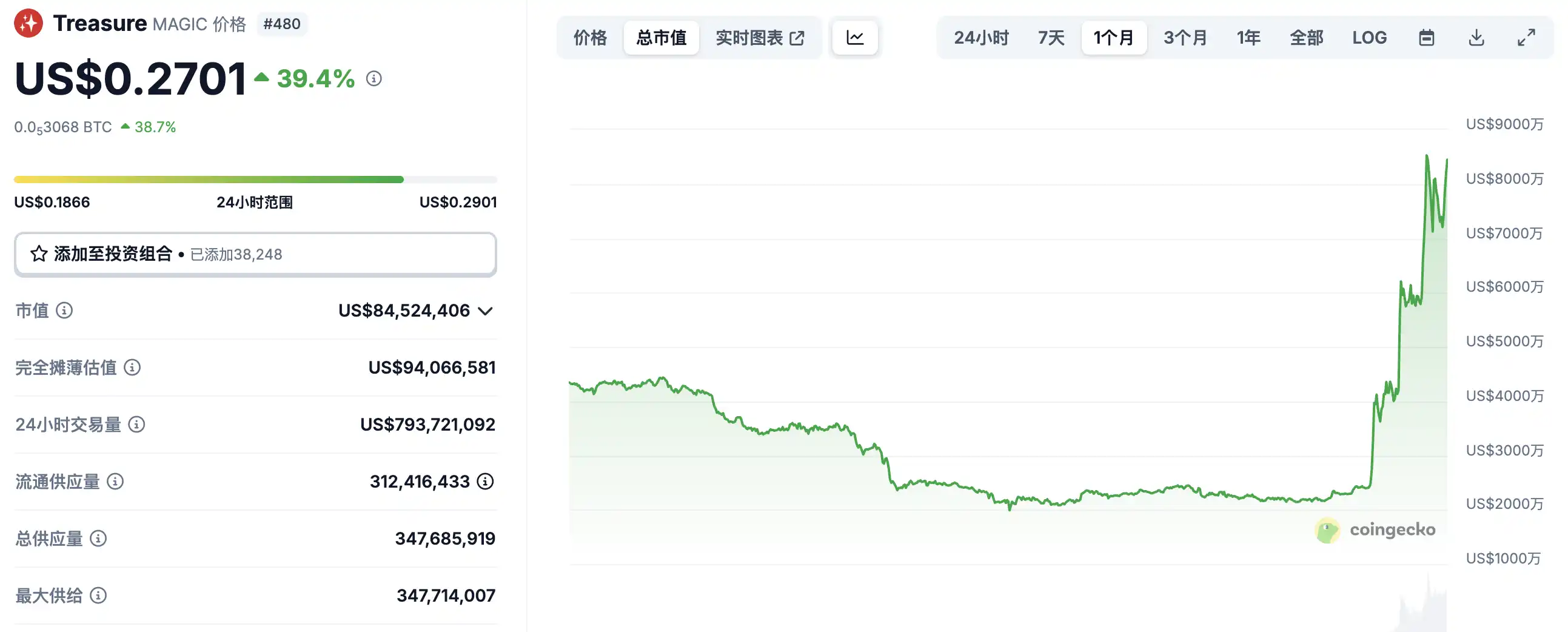首期上线的游戏就是 Abstract 的链上 RPG 游戏 Gigaverse,社区在尝试后普遍好评,而随之 Treasure 的币价也相应地回暖,在之前宣布退出 GameFi 业务后跌至 2000 万美元市值,而今日回到了 8000 万美元市值。相信除了对将 NFT AI 化的技术的预期外,由 AI Agent 玩 GameFi 的模式可能更加吸引人,对 GameFi 项目方来说没人玩、对玩家来说游戏不好玩的问题在未来有可能能够由资产化的 AI Agent 解决。