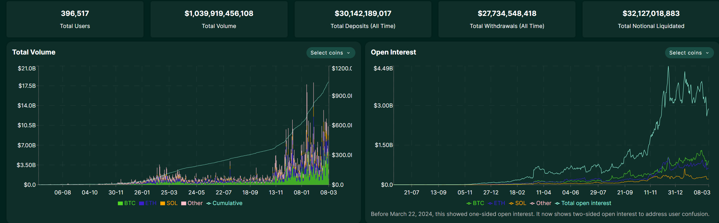 然而在链上,尽管 DEX 现货交易量稳居数十亿美元量级,但去中心化衍生品却始终未能撕开市场缺口:dYdX 日均交易量约 1900 万美元,曾经风头无两的 GMX,其持仓量与 24 小时交易量更双双跌破 1000 万美元,差不多被市场遗忘。