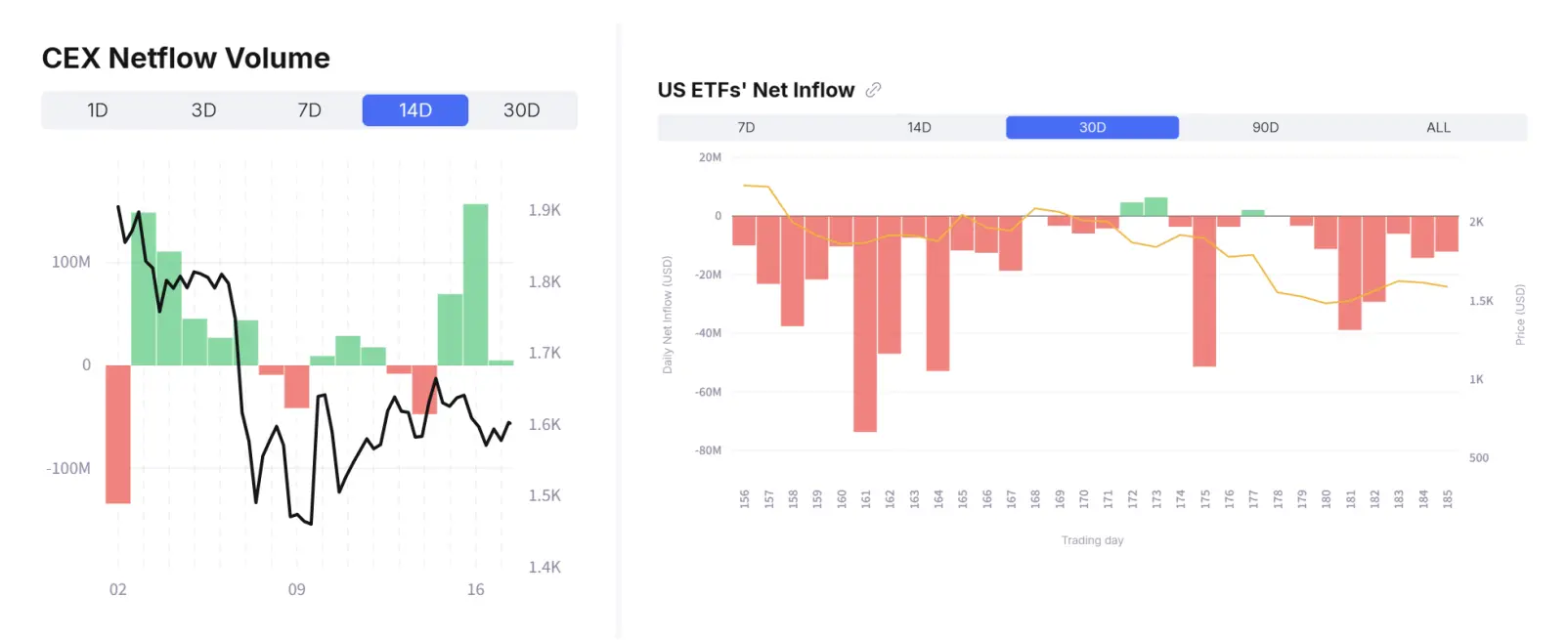 从以太坊在 CEX 上的资金流动情况与现货 ETF 的表现来看,整体走势同样不容乐观。以太坊现货 ETF 已连续 30 天几乎处于净流出状态,市场资金持续撤离。与此同时,过去 14 天里,以太坊在CEX的流入量明显高于流出量,大量 ETH 被转入交易所,释放出抛压信号。