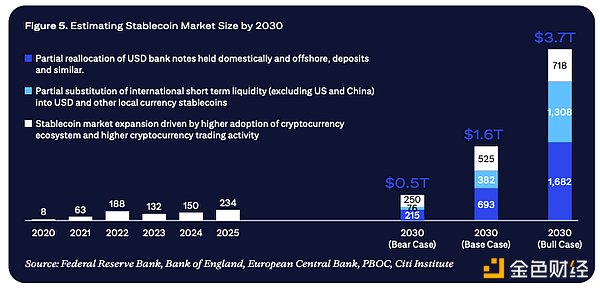 花旗研究所预计,2030年稳定币市场规模的基准情形为1.6万亿美元,乐观情形为 3.7 万亿美元,悲观情形为 0.5 万亿美元。