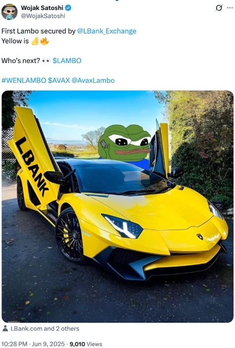 KOL Wojak Satoshi 更在 X 平台公开发声:“First Lambo secured by @LBank_Exchange”,印证了 LBank 在链上情绪与财富转化率上的承载力与平台硬实力。