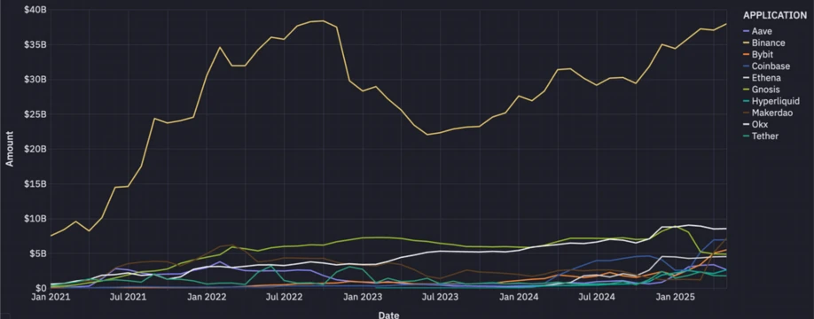 中心化交易所继续锚定稳定币供应,在各生态系统中占据了很大一部分流通量。