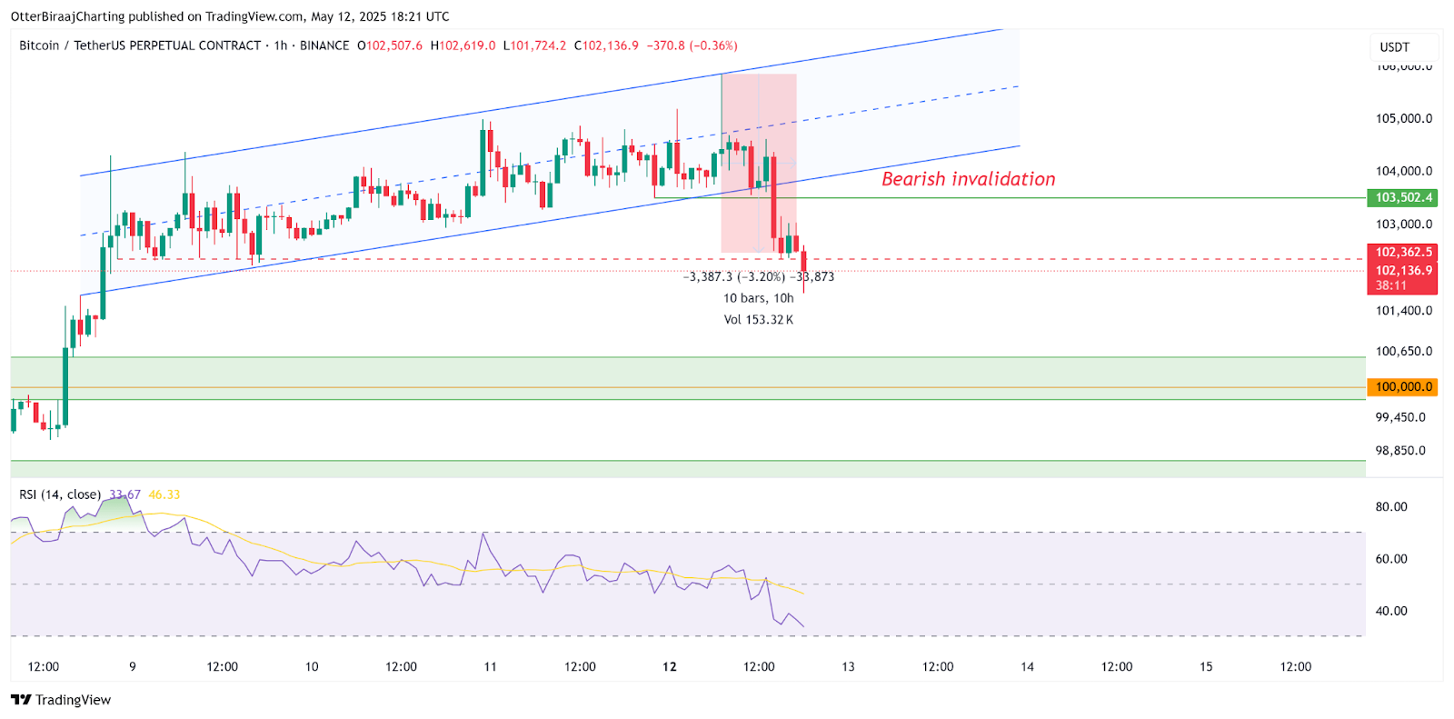 5月12日,比特币短暂突破105,800美元后迅速回落至101,400美元,1小时K线图显示价格跌破上升通道下沿。