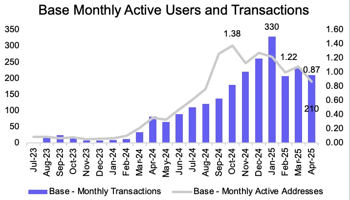 Base 与 Solana 的月活跃地址与月交易量对比。来源:Artemis